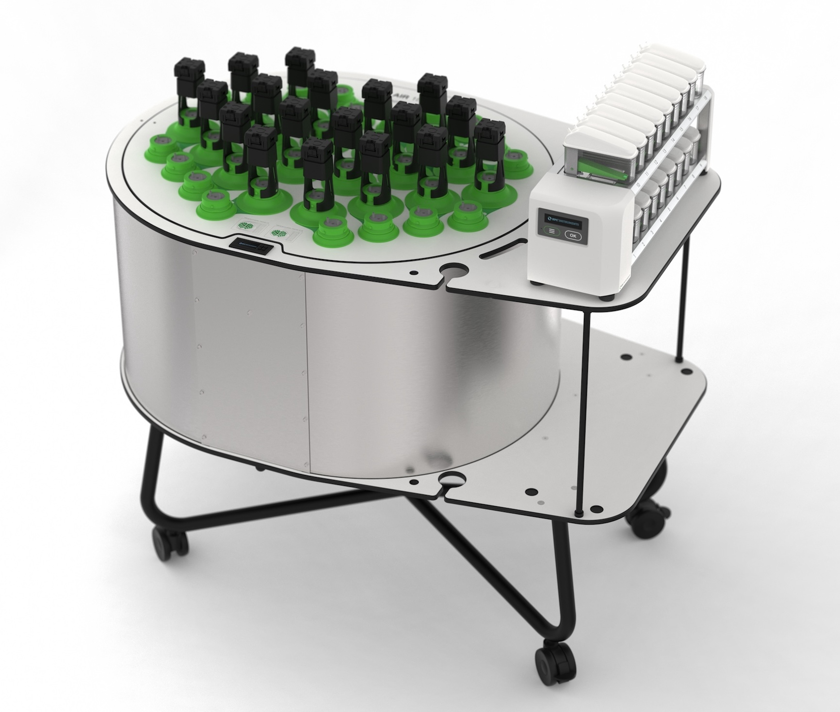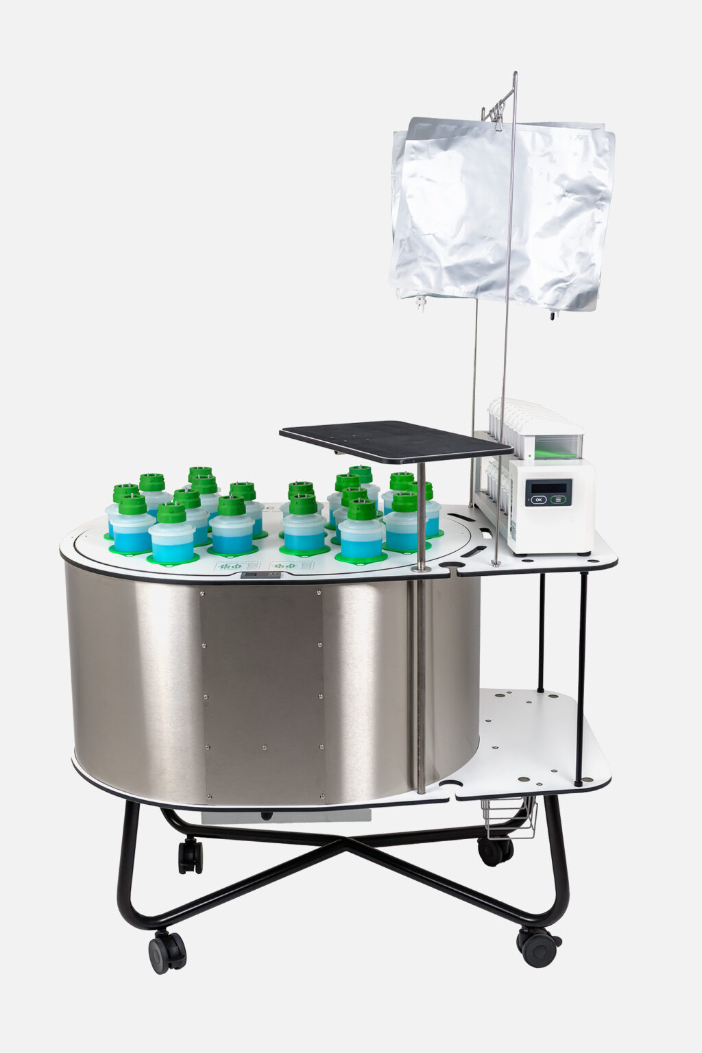 BPC Air能够同时容纳多达18个不同大小(0.5升、1升和2升)的反应器,其控温范围从10°C到60°C,非常适合在室内常温状态(大约22-25°C)下进行微生物培养。它的最突出特点在于其仅需120W的绿色低能耗,相比市场上其他商用空气恒温培养箱以及传统的恒温水槽,大大降低了能源消耗。